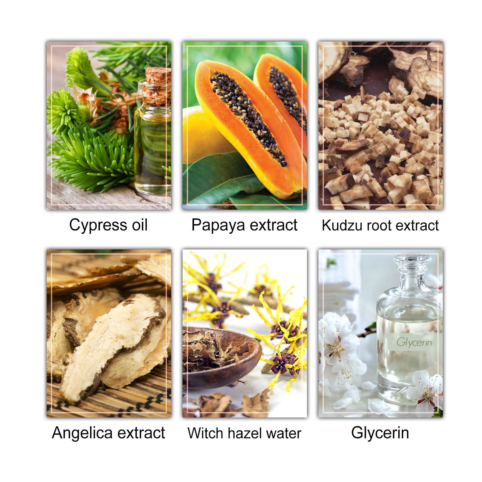 Ingredients: Cypress oil, papaya extract, kudzu root extract, angelica extract, Thayers, glycerin
